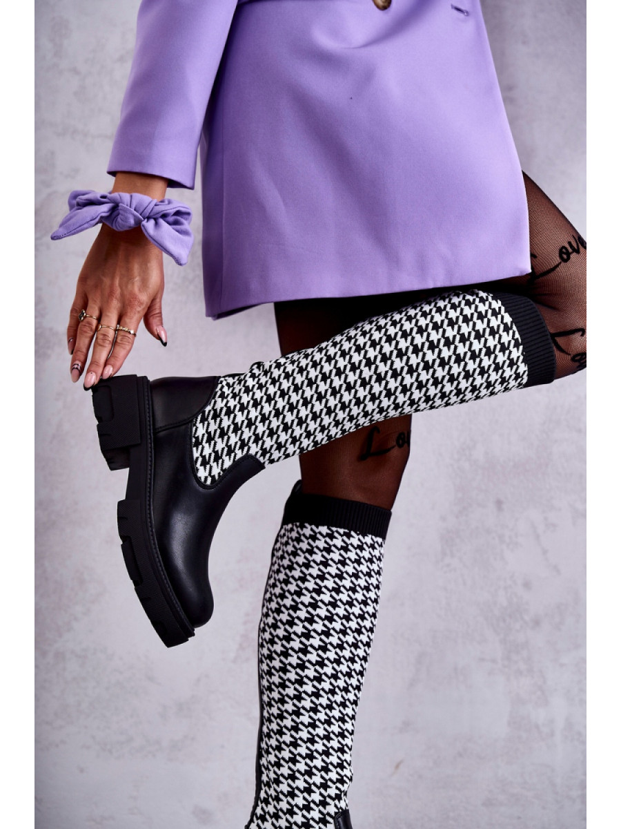 Des bottes pour femmes exceptionnelles qui raviront tous les amateurs de nouvelles mode ! Fabriqué à partir d'une combinaison de tissu élastique et de cuir écologique. Réchauffé avec une couverture de chaussure à la hauteur du pied. Ce modèle est doté d'un talon renforcé. Monté sur un talon plat avec une plateforme. Ces chaussures ont un léger bourrelet sur le dessus de la tige. Vous créerez de nombreux styles intéressants avec ce modèle !