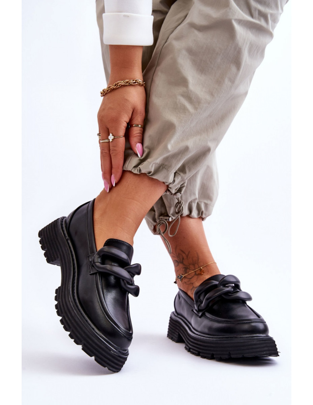 Ces mocassins à la mode ont été fabriqués en cuir écologique. Ils reposent sur une plateforme et un talon plat. Les mocassins sont dotés d'une chaîne décorative sur le devant. La semelle intérieure en cuir écologique garantit une utilisation confortable des chaussures. De plus, le contrefort du talon de ces chaussures est renforcé.