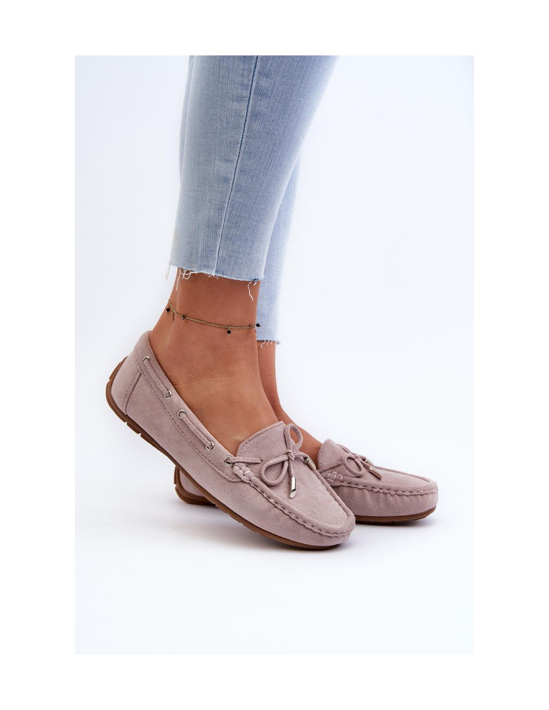 Les mocassins classiques pour femmes ont été fabriqués à partir d'éco-suède. Ce modèle est orné d'un nœud décoratif sur le devant et de cordes qui s'entrelacent sur les côtés de la tige. Les mocassins sont montés sur une semelle antidérapante. La semelle intérieure en éco-cuir souple assure le confort pendant l'utilisation de la chaussure. Elle est en outre délicatement perforée. Ces mocassins doivent absolument faire partie de votre collection de chaussures !