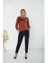 Vous appréciez le confort et la commodité ? Découvrez notre ensemble sport-chic. Pourquoi est-elle si spéciale ? Parce qu'il a été conçu en tenant compte d'un large éventail de tailles et d'une grande polyvalence. Nous l'avons cousu à partir d'un tricot doux et extensible de type MORGAN, qui, associé à des talons aiguilles, rend la tenue plus élégante, mais s'accorde aussi parfaitement avec des chaussures de sport. Vous pouvez donc le porter aussi bien pour les achats quotidiens que pour des rencontres occasionnelles avec des amis. Des coutures soignées, des imprimés décoratifs et des ferrures métalliques vous feront vous sentir spécial. Les pantalons sont caractérisés par une taille haute et une coupe dite "carotte". Ils ont une large ceinture élastique, réglée en plus par une ficelle. Le chemisier a une coupe ample et classique. Tout cela pour que les femmes de différentes tailles se sentent à l'aise dans les vêtements LaAurora.